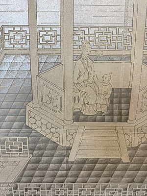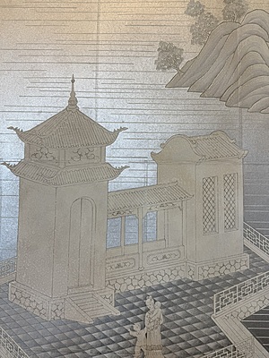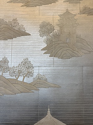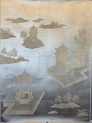 Handpainted landscape and figure design (SY-225) on a pieced silver background. Mounted on muslin. 95.75"H X 71.5"W.