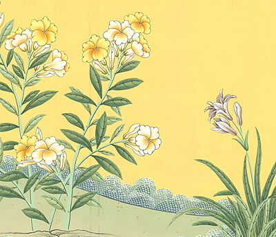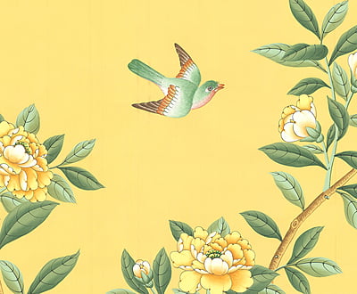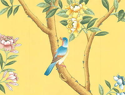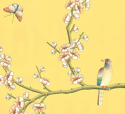 Handpainted Chinese design with flowering trees, birds, and butterflies on a yellow background. Background is non-pieced and non-antiqued. 3 panels at 3'W X 10'H each with a 90" maximum design height.