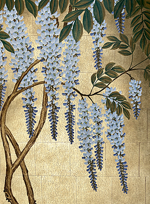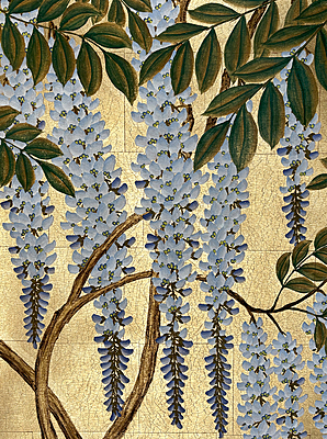 Handpainted SY-803G wallpaper panel with wisteria on a gold leaf background. On muslin backing. Some crazing in the background. 95.5"H X 35.75"W.