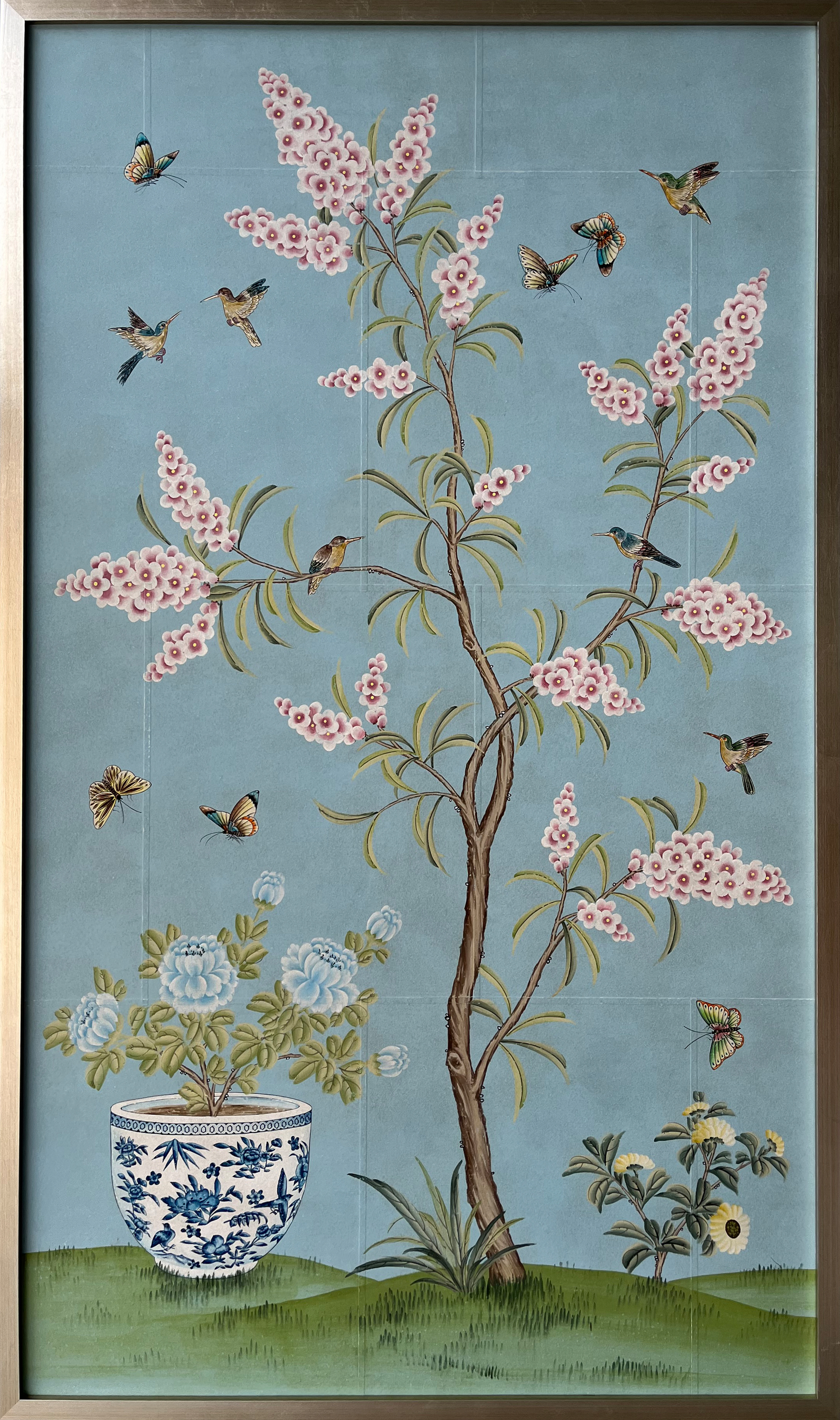 Handpainted Chinese design with a muted color palette on a soft blue background. Background is pieced and antiqued. In silver box frame with patina. 37.75"W X 63.75"H. Complementing pair available.