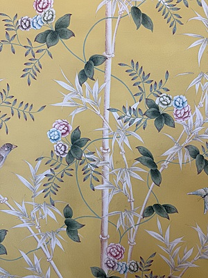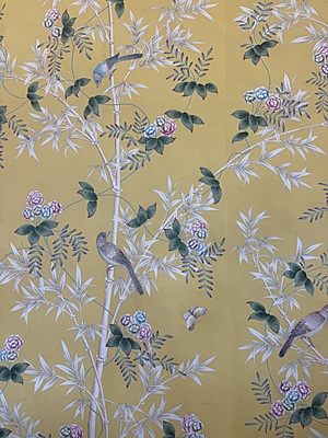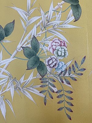 Handpainted bamboo floral design (SY-128Y) on antiqued yellow background. Mounted on muslin. 95.75"H X 71"W.