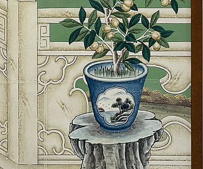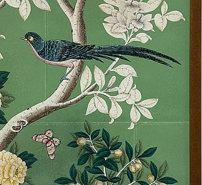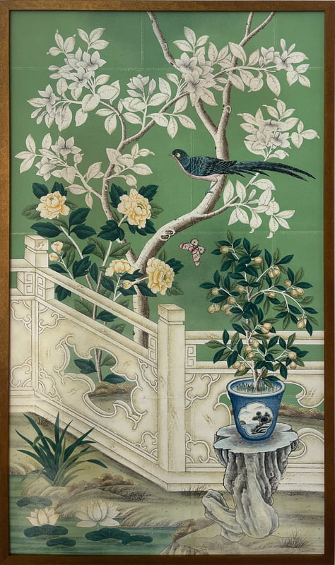 Handpainted Chinese design with flowering trees, fencing, birds, and butterflies on a green background. Background is pieced and antiqued. In gold box frame with patina. 37.75"W X 63.75"H. Complementing pair available.