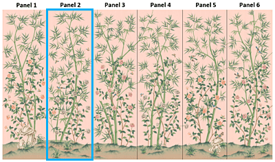 Inspired by 19th Century Chinese wallpaper in Belton House in Lincolnshire, UK, this layered beauty was designed so it could be trimmed from the top. Each panel measures 3'w x 10'h, and the full repeat is 6 panels wide, with panel 6 connecting to panel 1. Panels can be ordered individually in any quantity, and the minimum order is 1 panel.
