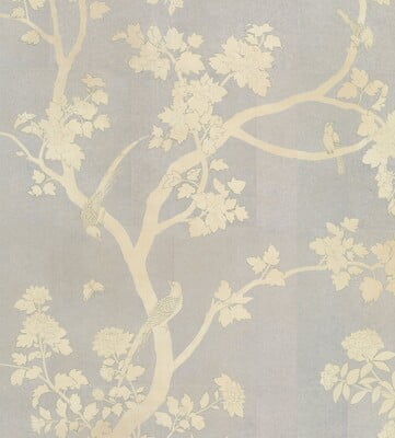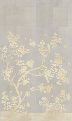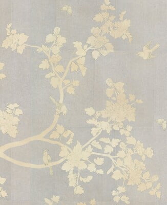 Handpainted chinoiserie silhouette design in ivory on a silver background.
