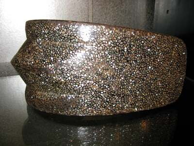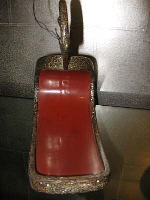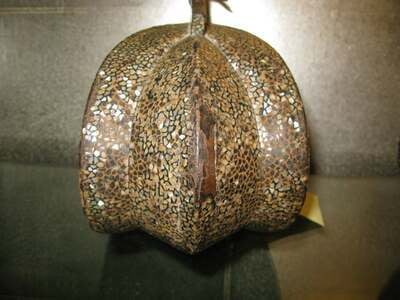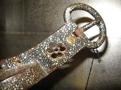 A fine pair of antique Japanese abumi (Samurai stirrups). Metal, with red lacquer interior, and inlaid mother of pearl (Raden) all over the outside, sides and bottom. With floral shaped open detail at the top of the metalwork.12"W X 10 1/2"H X 5 1/2"D EA