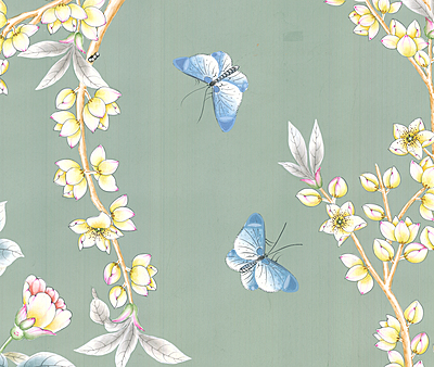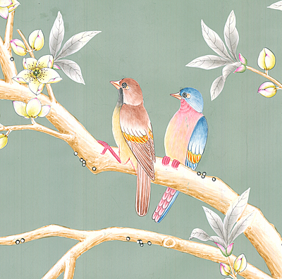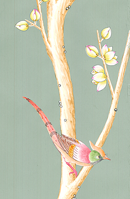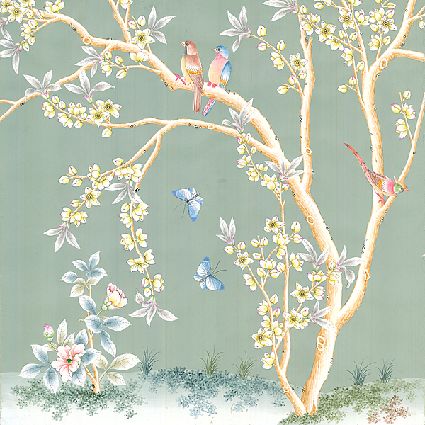 Celadon Garden (SY-21) handpainted wallpaper sample. Small tape mark and a couple of small tears. 28"H X 37.75"W.