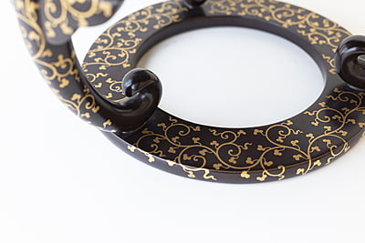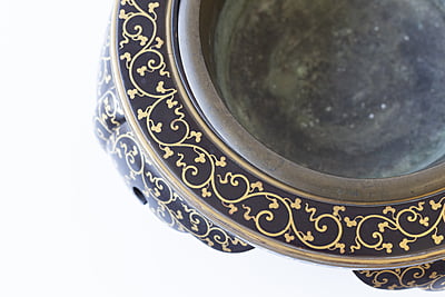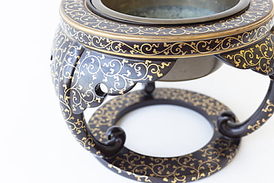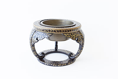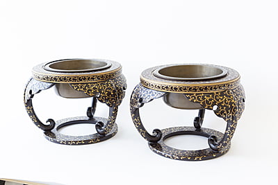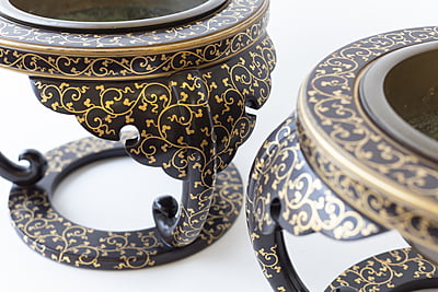 A pair of Japanese lacquer braziers (hibachis) in black lacquer with gold vine design. Such objects were used in households as handwarmers, with a small fire burning within the metal bowls. 16"W X 10"H EA