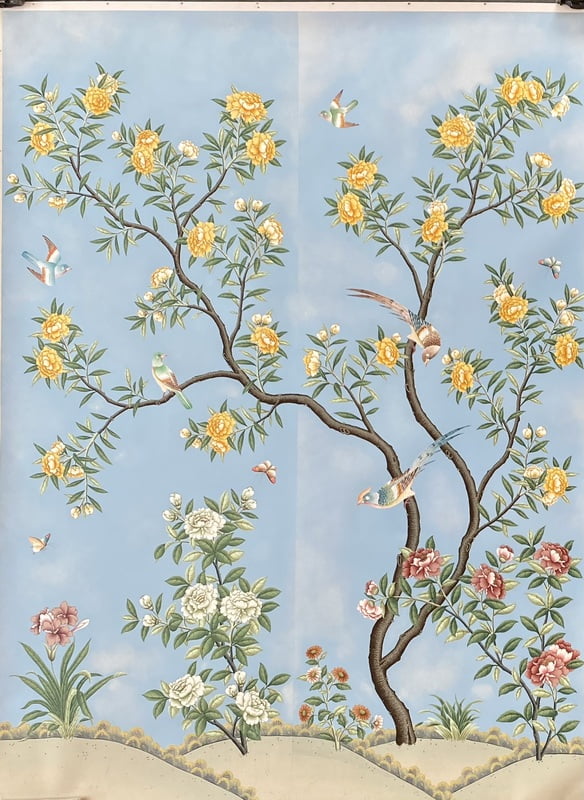 Handpainted floral design on bright blue background. Mounted on muslin. 95"H X 70 1/2"W.