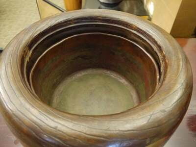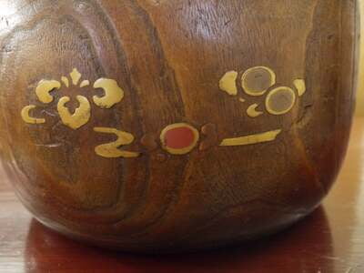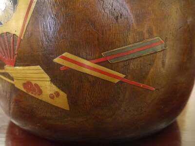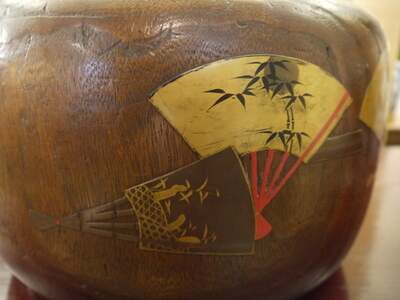 Beautifully made wooden hibachi with copper liner. Would be great as a planter. Design on the outside is of fans in red and gold lacquer, with inlaid mother-of-pearl. 15"W X 9"H