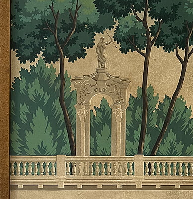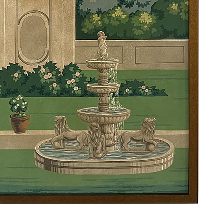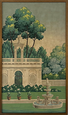 A handpainted formal garden scene in lush and varied green tones with intricate architectural elements. On an antiqued background. In gold box frame with patina. 37.75"W X 63.75"H. Complementing pair available.