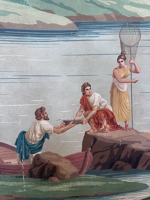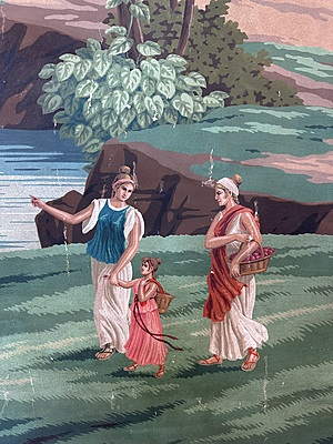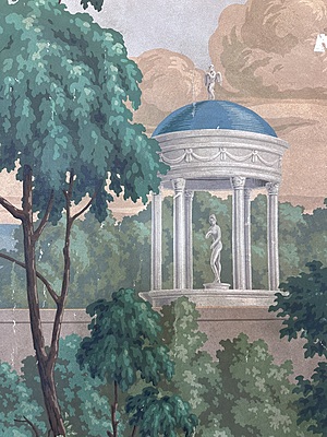 Colorful pastoral scene painted in Gracie's NY studio. Chips & scratches throughout. Mounted on muslin. Artwork dimensions 85.75"H X 71.25"W.