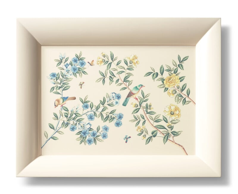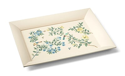 Elegant tray with a smooth lacquer finish, enhanced with details from the Heathcote scene, and a curving profile, which can also be used as a handle. This versatile piece can be used to serve drinks or keep personal items organized on a desk or vanity. Lacquer with brass hardware. 2"H X 17.5"D X 22.5"W