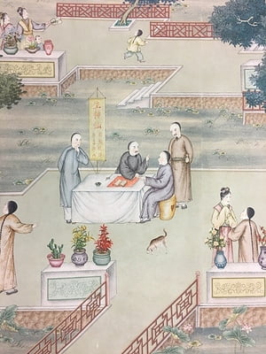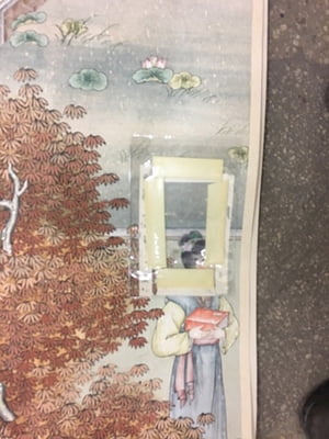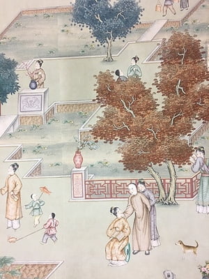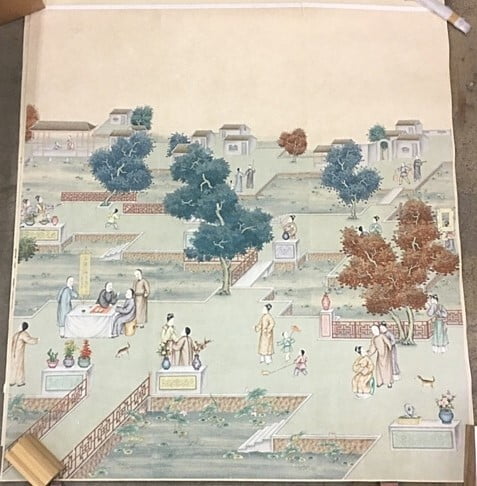 Handpainted chinoiserie landscape design with traditional village scenes on in a soft color palette on a light neutral background. Tear at top and adhesive right side. 103"W X 113"H.