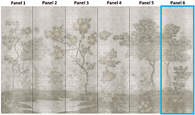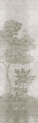 Our Grove design was inspired by Roman frescoes found intact in ancient villas and give the impression of a lush tropical garden. Our scene was designed to be able to trim from the top and/or the bottom and still envelop you in a peaceful surround. Each panel measures 3'w x 10'h, and the full repeat is 6 panels wide, with panel 6 connecting to panel 1. Panels can be ordered individually in any quantity, and the minimum order is 1 panel. Silver Grove is printed ink on handmade silver tea leaf giving a translucent effect.