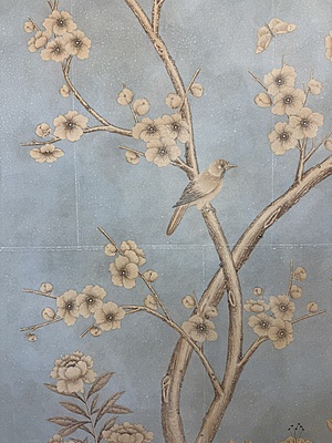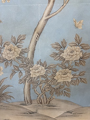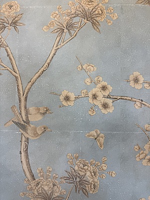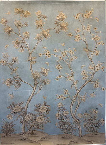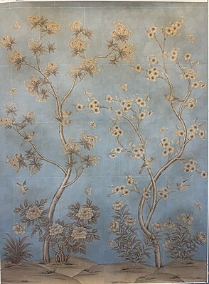 Handpainted scenic design (SY-238) on a pieced and antiqued blue background. Mounted on muslin. 95.75"H X 71.75"W.