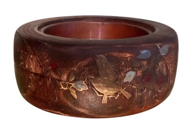 A low round antique Japanese wooden hibachi, with raised lacquer design of birds and branches in gold and red. With inset copper liner. 10 1/2"W X 4"H
