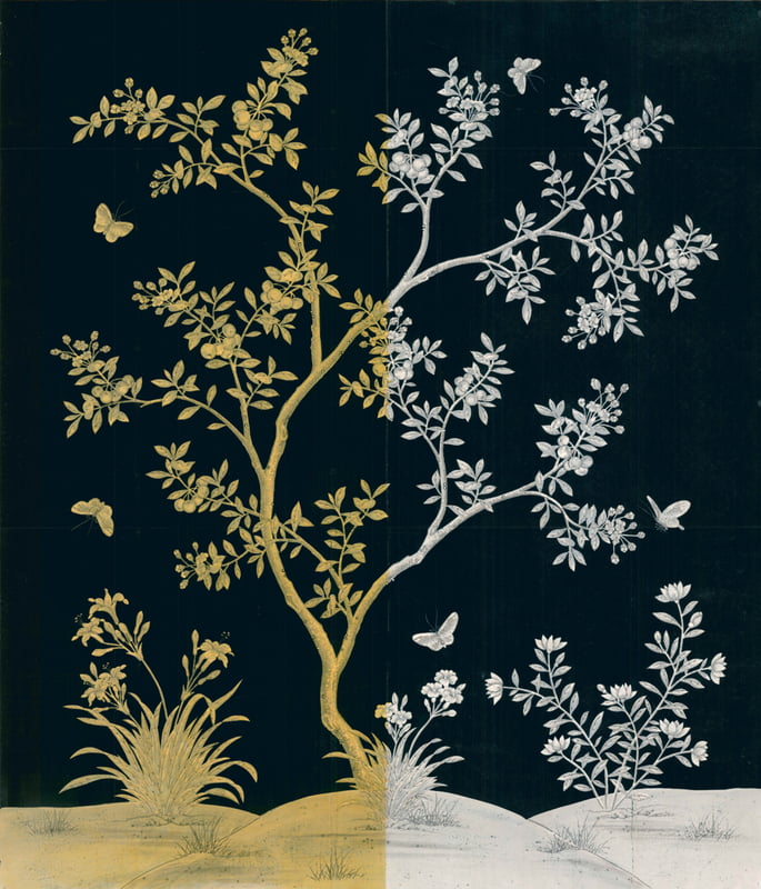 Handpainted Wallpaper Panel 37.5" W X 43.5" H Left half with yellow lacquer, right half glossy