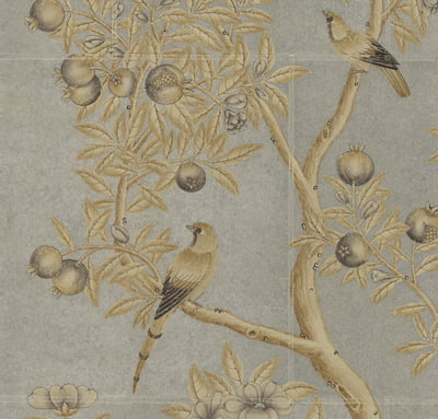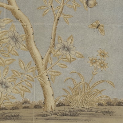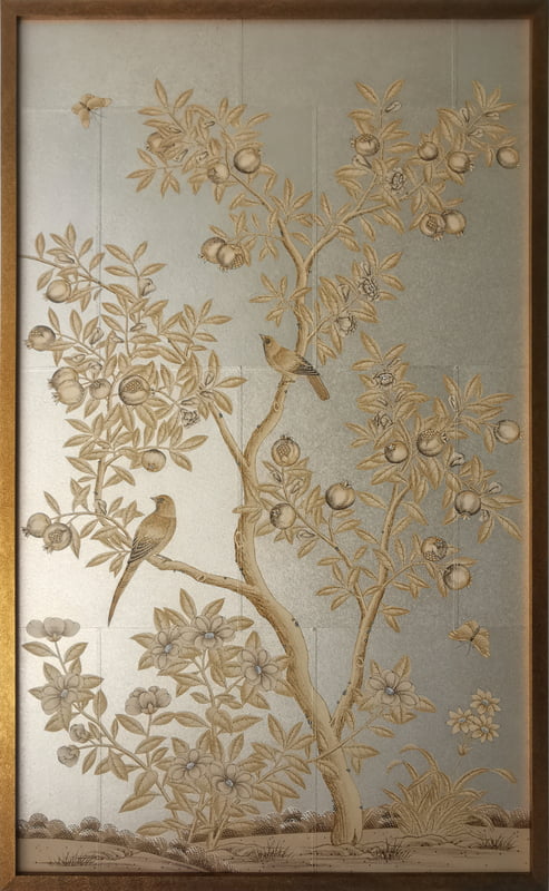 Handpainted chinoiserie design with a sepia and gray color palette on a silver background. Background is pieced and antiqued. In a gold frame with patina. 37.75"W X 63.75"H. Complementing pair available.