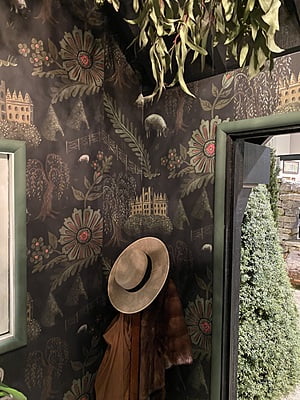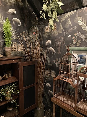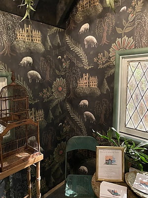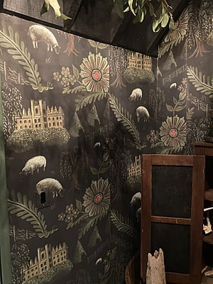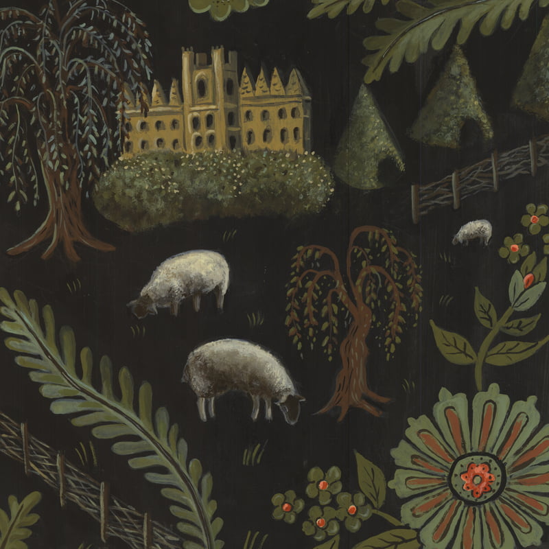 Custom wallpaper designed by Susan Saas for the 2022 Antiques & Garden Show of Nashville East Garden by Daigh Rick Landscape Architects. Whimsical design of sheep and castles printed on vinyl background. [4] rolls at 16 feet H X 36"W, [1] roll at 75"H X 36"W, [1] roll at 92"H X 36"W. Sold as a set only.