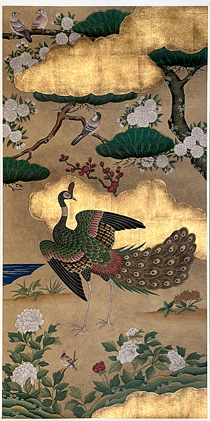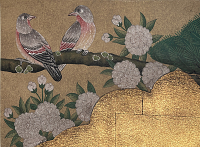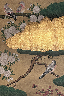 Handpainted wallpaper sample (SY-809). With gold leaf clouds, flowers, and birds. On muslin backing. 59"H X 29.25"W.