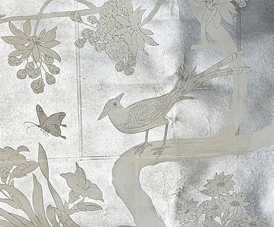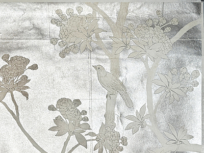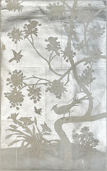 Handpainted wallpaper sample. Silver Silhouette design (SY-235). Slight damage top left. 60"H X 36"W.