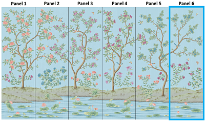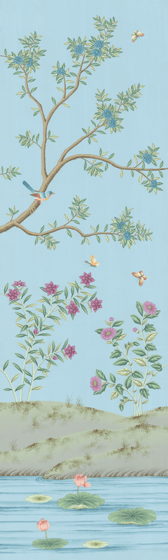 Inspired by traditional Chinese bird-and-flower scenic wallpaper popularized by Europe in the 18th and 19th Centuries, this design features towering trees and flowering bushes that sit above a tranquil pond with floating lily pads and lilies. Designed to allow for trimming some of the pond and/or tops of the trees, our Lily printed scene presents the look of antique wallpaper installations in the tradition of the grand homes of Europe. Each panel measures 3'w x 10'h, and the full repeat is 6 panels wide, with panel 6 connecting to panel 1. The panels can be ordered individually in any quantity, and the minimum order is 1 panel.