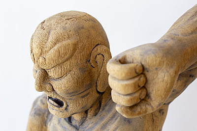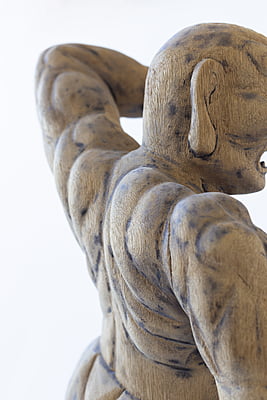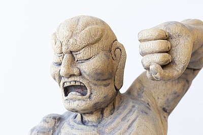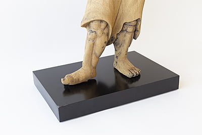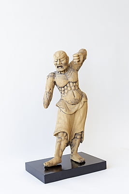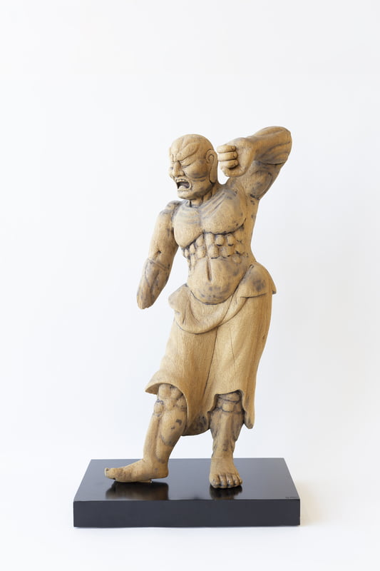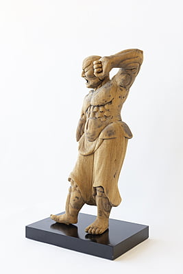 A large and dramatic muscled Nio guardian figure. Nio figures were placed outside Buddhist temples as protectors against evil spirits and to keep the temple free of demons and thieves. This figure stands on a custom stand. 18"W X 32"H X 12"D