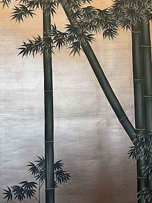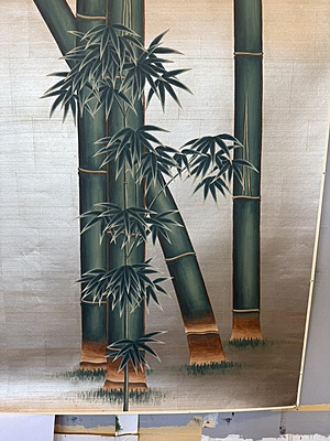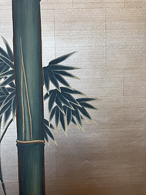 Handpainted design from a Japanese screen (SY-804) on silver leaf background. Mounted on muslin. 96"H X 71"W.