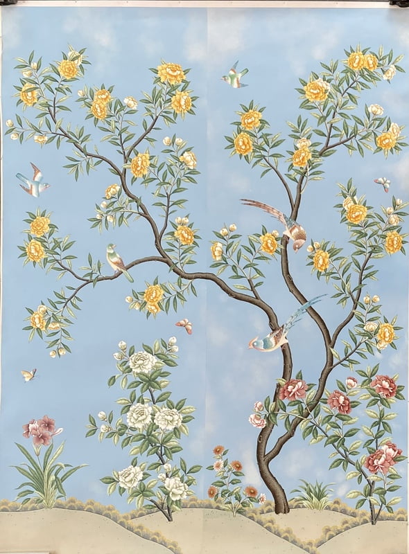 Handpainted floral design on bright blue background. Mounted on muslin. 95"H X 70 1/2"W.