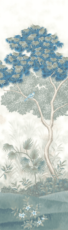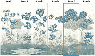 Our Grove design was inspired by Roman frescoes found intact in ancient villas and give the impression of a lush tropical garden. Our scene was designed to be able to trim from the top and/or the bottom and still envelop you in a peaceful surround. Each panel measures 3'w x 10'h, and the full repeat is 6 panels wide, with panel 6 connecting to panel 1. Panels can be ordered individually in any quantity, and the minimum order is 1 panel.