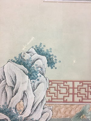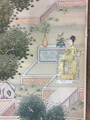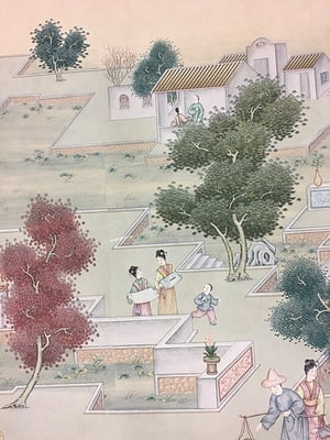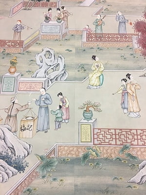 Handpainted chinoiserie landscape design with traditional village scenes on in a soft color palette on a light neutral background. Adhesive left side. 104.5"W X 113.5"H.