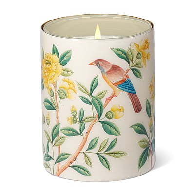 L'Ansecoy Orange Blossom scented candle presented in a Sage green frosted glass vessel branded in gold. It is enhanced with a gold lid that the candle can sit in when in use, and a brass sleeve decorated with details from the Heathcote scene. Inspired by the laid-back vibe of Mustique, the fragrance captures the flora that line the island's beaches, with sun-kissed orange blossom and sweet Cedar enhanced by the greens and citrus of Petitgrain. A beautiful addition to a table and perfect for gifting. Cream candle in a green glass vessel, brass hardware. Sleeve dimensions 4.3"H X 3.5"D X 3.5"W