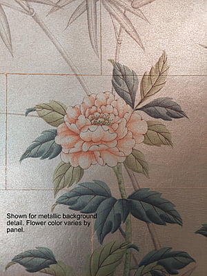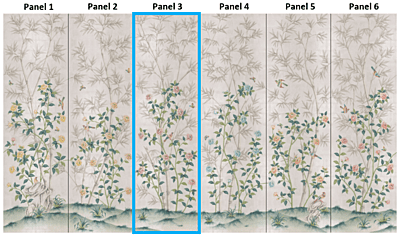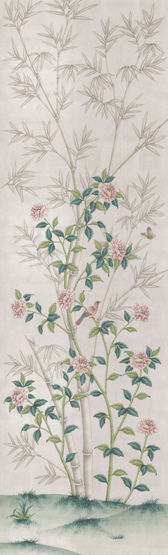 Inspired by 19th-century Chinese wallpaper in Belton House in Lincolnshire, UK, this layered beauty was designed so it could be trimmed from the top. Each panel measures 3'w x 10'h, and the full repeat is 6 panels wide, with panel 6 connecting to panel 1. Panels can be ordered individually in any quantity; the minimum order is 1 panel. Silver Belton is printed ink on handmade silver tea leaf, creating a translucent effect.