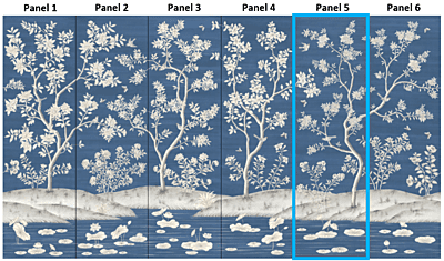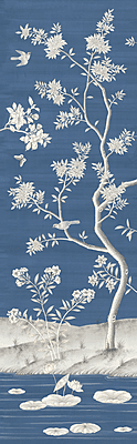 Inspired by traditional Chinese bird-and-flower scenic wallpaper popularized by Europe in the 18th and 19th Centuries, this design features towering trees and flowering bushes that sit above a tranquil pond with floating lily pads and lilies. Designed to allow for trimming some of the pond and/or tops of the trees, our Lily printed scene presents the look of antique wallpaper installations in the tradition of the grand homes of Europe. Each panel measures 3'w x 10'h, and the full repeat is 6 panels wide, with panel 6 connecting to panel 1. The panels can be ordered individually in any quantity, and the minimum order is 1 panel. The background of Navy Lily was painted to have a visible strié effect.