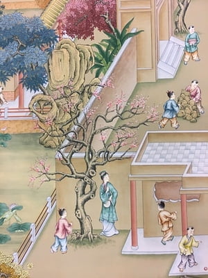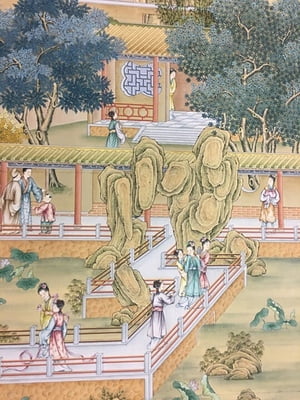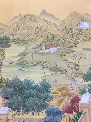 Handpainted landscape and figure design. 71"W X 96"H.