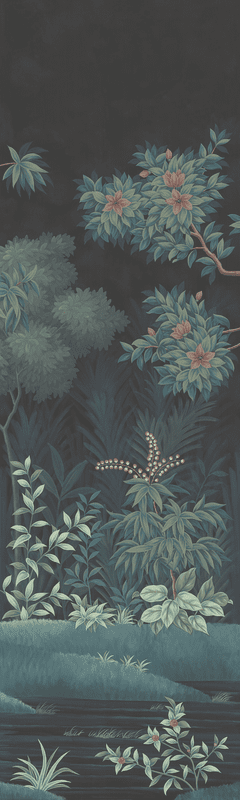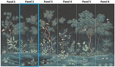 Our Grove design was inspired by Roman frescoes found intact in ancient villas and give the impression of a lush tropical garden. Our scene was designed to be able to trim from the top and/or the bottom and still envelop you in peaceful surround. Each panel measures 3'w x 10'h, and the full repeat is 6 panels wide, with panel 6 connecting to panel 1. Panels can be ordered individually in any quantity, and the minimum order is 1 panel.