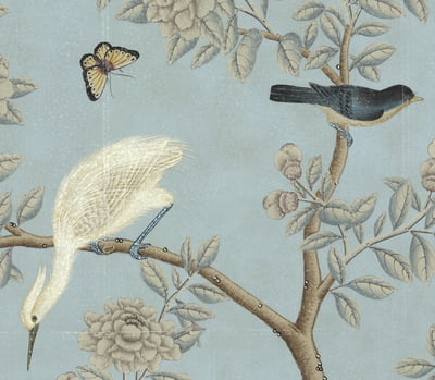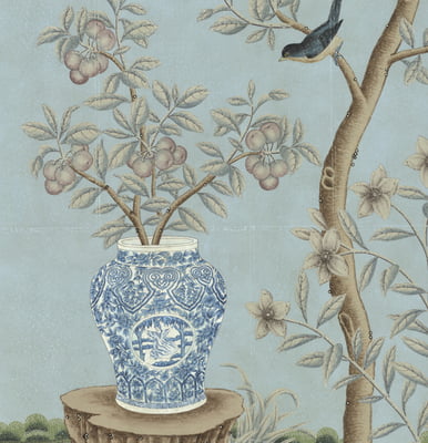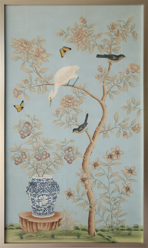 Handpainted Chinese design with a muted color palette on a soft blue background. Background is pieced and antiqued. In silver box frame with patina. 37.75"W X 63.75"H. Part of an available triptych.