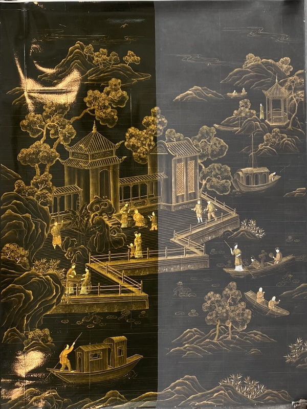 Handpainted landscape and figure gold design on black background. Left half with high gloss lacquer. Mounted on muslin. 95"H X 70 1/2"W.