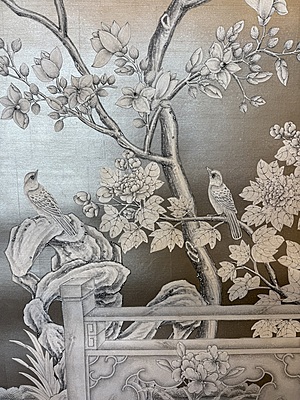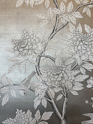 Ivory flower & bird design (SY-234) on silver leaf background. Mounted on muslin. 95.5"H X 71.5"W.