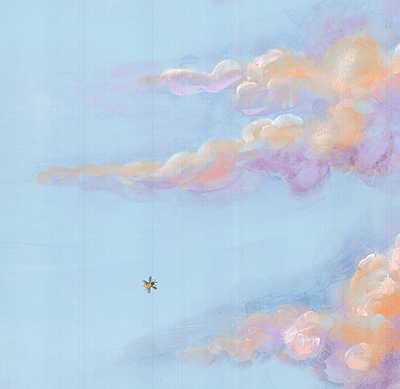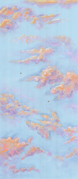 Handpainted wallpaper sample of sky and clouds with bees. 86"H X 38"W.
