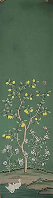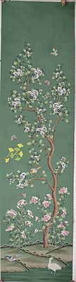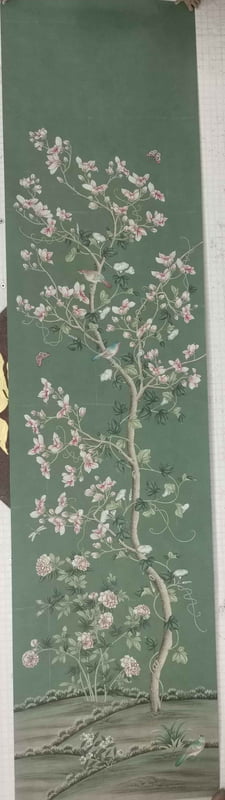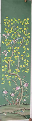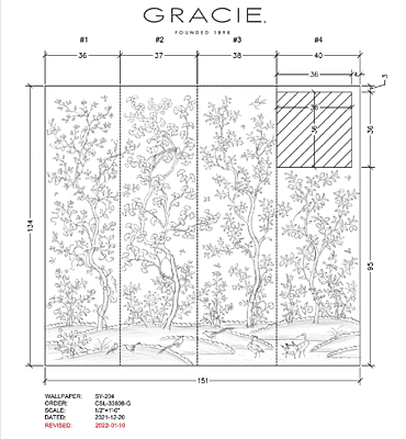 Four-panel continuous scenic wallpaper. Custom version of Jade Canopy (Jade Canopy-LA). Panel 1: 36"W X 134"H, Panel 2: 37"W X 134"H, Panel 3: 38"W X 134"H, Panel 4: 40"W X 95"H