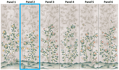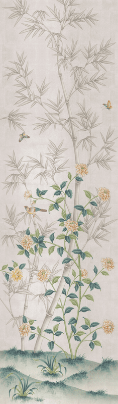Inspired by 19th-century Chinese wallpaper in Belton House in Lincolnshire, UK, this layered beauty was designed so it could be trimmed from the top. Each panel measures 3'w x 10'h, and the full repeat is 6 panels wide, with panel 6 connecting to panel 1. Panels can be ordered individually in any quantity; the minimum order is 1 panel. Silver Belton is printed ink on handmade silver tea leaf, creating a translucent effect.