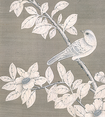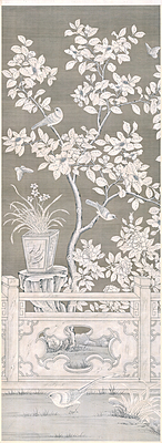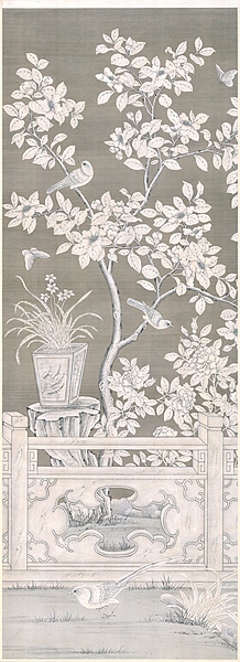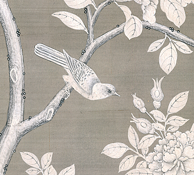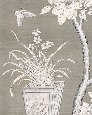 Handpainted Winter Garden wallpaper sample. On muslin backing. 79"H X 29"W.
