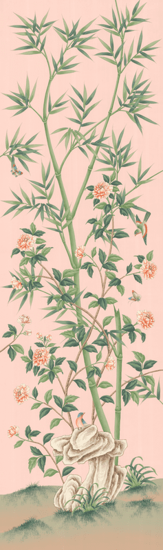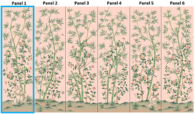Inspired by 19th Century Chinese wallpaper in Belton House in Lincolnshire, UK, this layered beauty was designed so it could be trimmed from the top. Each panel measures 3'w x 10'h, and the full repeat is 6 panels wide, with panel 6 connecting to panel 1. Panels can be ordered individually in any quantity, and the minimum order is 1 panel.