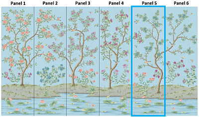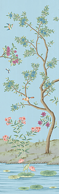 Inspired by traditional Chinese bird-and-flower scenic wallpaper popularized by Europe in the 18th and 19th Centuries, this design features towering trees and flowering bushes that sit above a tranquil pond with floating lily pads and lilies. Designed to allow for trimming some of the pond and/or tops of the trees, our Lily printed scene presents the look of antique wallpaper installations in the tradition of the grand homes of Europe. Each panel measures 3'w x 10'h, and the full repeat is 6 panels wide, with panel 6 connecting to panel 1. The panels can be ordered individually in any quantity, and the minimum order is 1 panel.