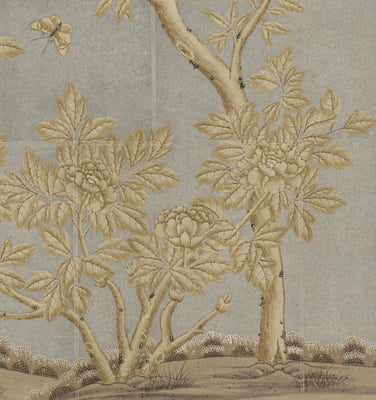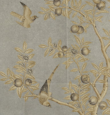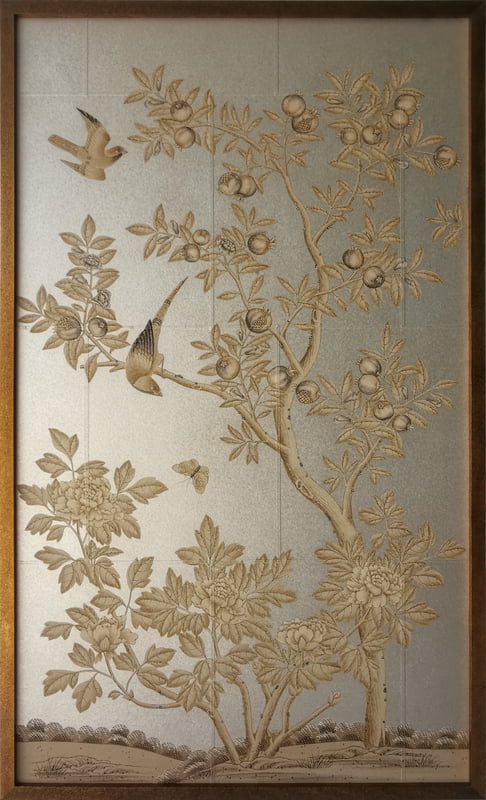Handpainted chinoiserie design with a sepia and gray color palette on a silver background. Background is pieced and antiqued. In a gold frame with patina. 37.75"W X 63.75"H. Complementing pair available.