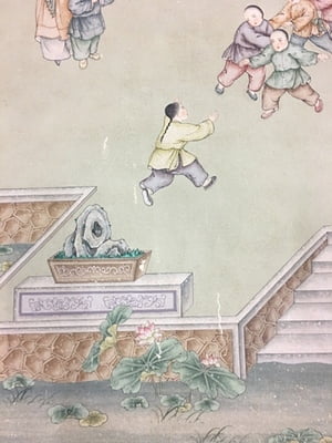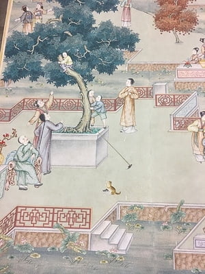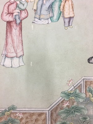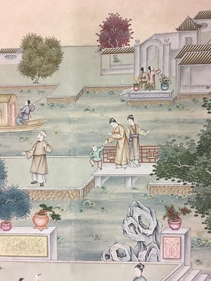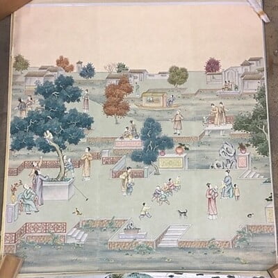 Handpainted chinoiserie landscape design with traditional village scenes on in a soft color palette on a light neutral background. Some scratches. 103"W X 110"H.