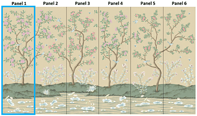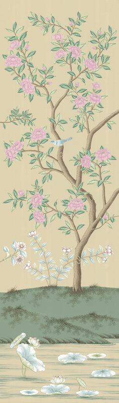 Inspired by traditional Chinese bird-and-flower scenic wallpaper popularized by Europe in the 18th and 19th Centuries, this design features towering trees and flowering bushes that sit above a tranquil pond with floating lily pads and lilies. Designed to allow for trimming some of the pond and/or tops of the trees, our Lily printed scene presents the look of antique wallpaper installations in the tradition of the grand homes of Europe. Each panel measures 3'w x 10'h, and the full repeat is 6 panels wide, with panel 6 connecting to panel 1. The panels can be ordered individually in any quantity, and the minimum order is 1 panel.